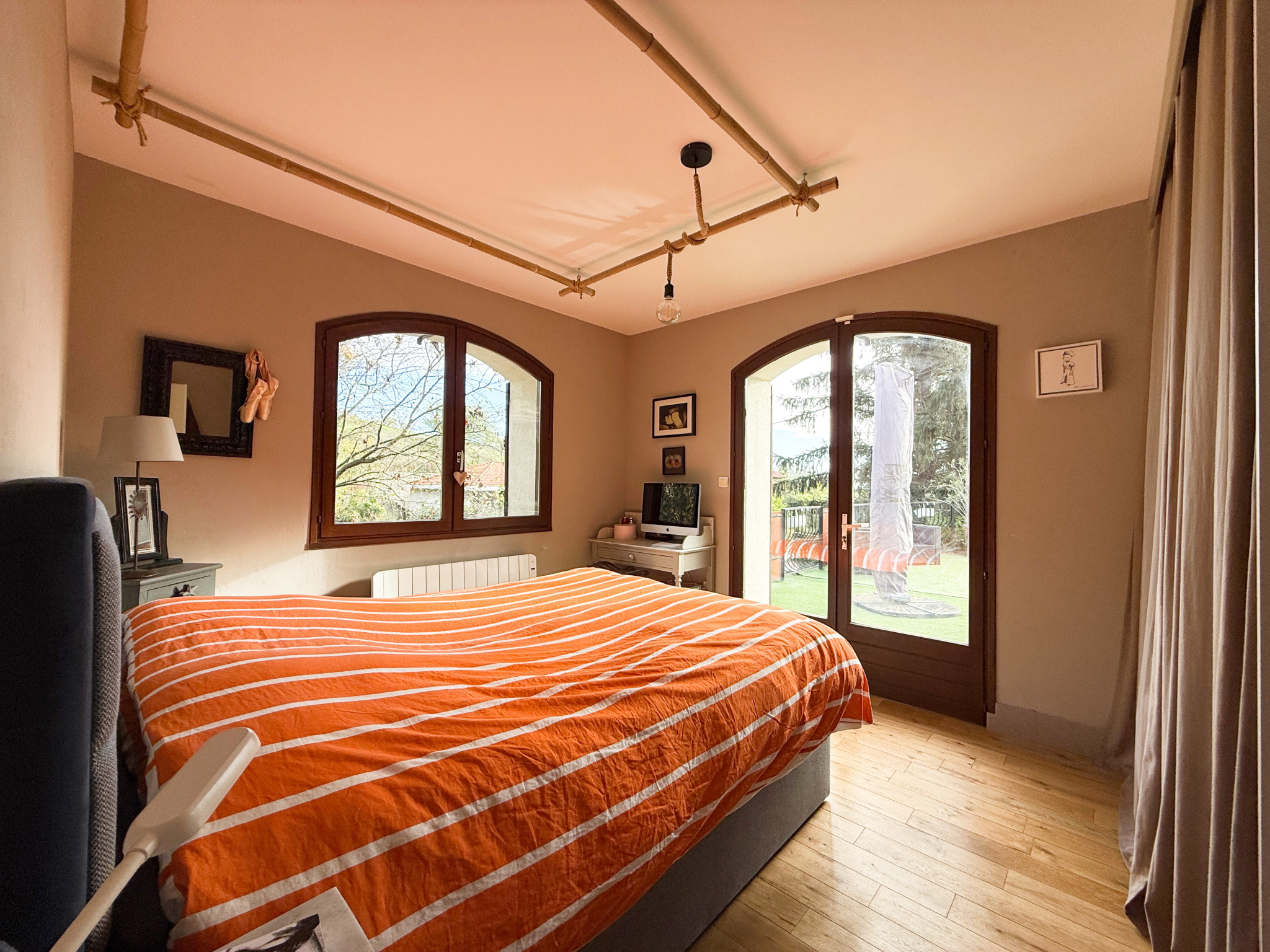 À l’étage principal, une vaste entrée dessert une pièce de vie lumineuse ouvrant sur une terrasse exposée sud-est, une cuisine indépendante équipée donnant également sur ce même extérieur, deux chambres, un bureau (ou troisième chambre), une salle de bains et un WC séparé.